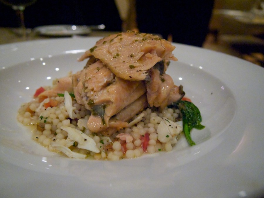 Provo River trout with crab and citrus couscous and lemon and chive nage