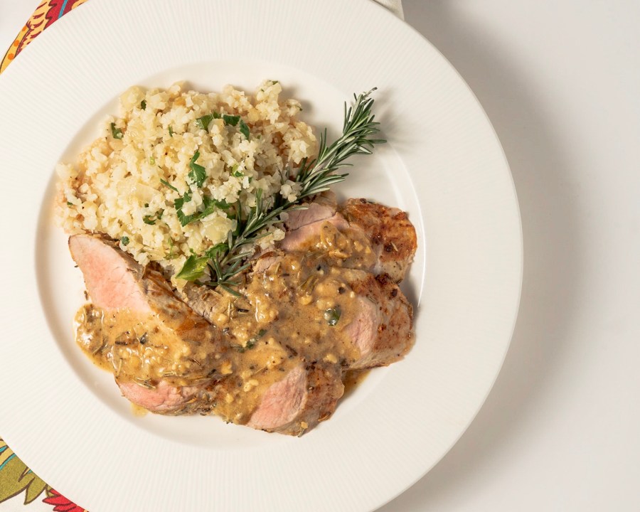 Serve pork alongside rice or mashed potatoes. I serve mine with riced cauliflower.